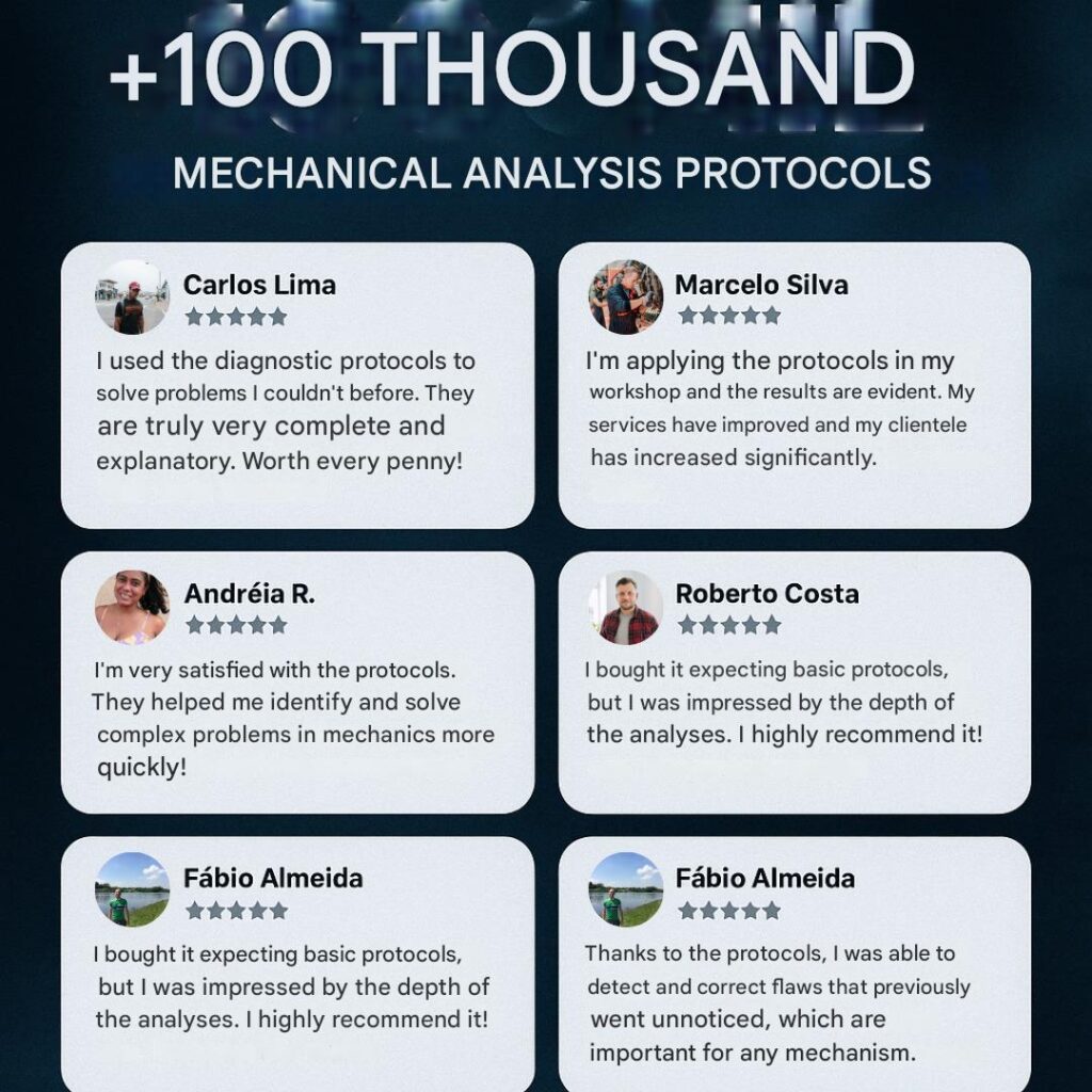 Use the 100,000 protocols with the knowledge you already have to solve electrical and mechanical failures, restoring your workshop's profit and efficiency quickly and safely.